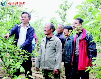 为认真贯彻落实全市“作风建设年”活动部署要求,近日,奎文区东关街道工福街社区邀请农业专家走进临朐县寺头镇老庄子村开展“爱在老庄子”城乡互助帮扶活动。农业专家为该村近30名果农讲解果树种植以及管理技术,深受果农欢迎。图为农业专家在给果农讲解技术。 记者王晓光摄