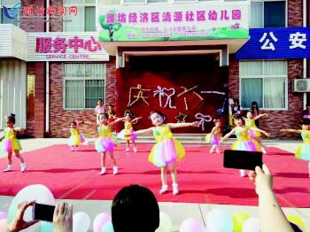 连日来,我市各地举办以庆祝“六一”为主题的文艺演出,丰富了孩子们的生活,让他们感受到童年的幸福和节日的快乐,同时拉近了孩子们和家长的距离,有利于孩子健康成长。图为潍坊经济开发区北城街道清源社区幼儿园庆“六一”演出现场。 杨杉杉摄