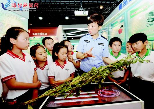 6月26日,青州市通过组织城乡学生观看主题展览、走进示范基地等形式,大力推进毒品预防教育,从思想上行动上增强广大青少年识毒、防毒、拒毒能力。图为民警介绍毒品的危害。 记者王晓光摄