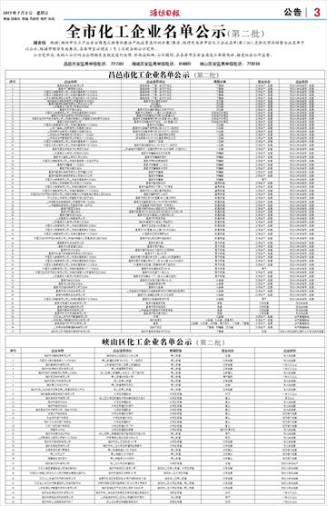 编者按 根据《潍坊市化工产业安全隐患大排查快整治严执法紧急行动方案》要求,现将有关县市区化工企业名单(第二批)、危险化学品经营企业名单予以公示。根据市领导有关要求,各县市区必须在7月5日前全部公示完毕。 公示完毕后,未纳入公示的企业将按有关规定进行关停,并依法取缔。公示期间,在各县市区安监局设立举报电话,接受社会公开监督。 昌邑市安监局举报电话:7212383 潍城区安监局举报电话:8188651 峡山区安监局举报电话:7736168
