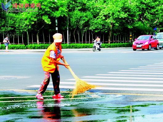 近期,我市迎来汛期,降雨不断。为保证交通顺畅、市民出行安全,市环卫处及时组织人员对道路两侧积水进行清理。图为8月8日下午,一场降雨之后,高新区桐荫街东方路路口环卫工人正在进行扫水作业。