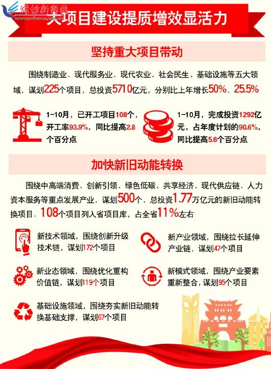 □本报记者 王晓丽 隆冬时节,寒气袭人。但在全市各个地区,项目建设的热浪丝毫没有因季节的变化而减退。在高铁潍坊北站建设现场,挖掘机、运输车、打桩机、吊车等施工设备正紧锣密鼓加快施工,确保与济青高铁同步投入运营;在高新区,盛瑞8AT配套产业园采用“工业地产+以商招商”运作模式顺利推进,成为以商招商的产业发展典范;寿光市引进万达广场项目,是万达集团在江北县级市投资开发的首个商业实体项目;寒亭规划建设嘉实科技孵化产业园,创新了园区开发模式、招商模式、服务模式……一批重大项目尤其是新兴产业项目的落地开工,推动了全市产业结构调整,加速了产业集约集聚和产城融合提升,为加快全市经济社会发展增添了动力和活力。 十九大报告指出,我国经济已由高速增长阶段转向高质量发展阶段。记者从市发改委了解到,2017年是实施“项目建设年”的第一年。2017年,全市各级各部门认真贯彻落实市委、市政府决策部署,紧紧围绕推进“四个城市”建设,坚持把项目建设作为推动产业转型、发展升级的“动力引擎”,以实施新旧动能转换重大工程为抓手,全市重点项目建设量质齐升,搭建起推动转型发展的四梁八柱。 坚持重大项目带动,在做大总量、支撑发展方面实现新突破 项目建设是加快发展的动力所在,更是撬动经济升级的强力杠杆。记者从市发改委获悉,2017年全市围绕制造业、现代服务业、现代农业、社会民生、基础设施等五大领域,谋划包装了225个项目作为市级重大项目,总投资5710亿元,分别比上年增长50%、25.5%。 ——项目开工率高。2017年1—10月,计划开工项目已开工108个,开工率93.9%,同比提高2.8个百分点。15个县市区、开发区计划开工项目全部开工。山东富锐激光雷达产业园、山东高创金融(基金)小镇,潍坊港西港区5000吨级航道工程、白浪河综合提升工程滨海段等一批现代产业、基础设施和民生保障重大项目开工建设。 ——项目进度快。2017年1—10月份完成投资1292亿元,占年度计划的90.6%,同比提高5.6个百分点。歌尔光电产业园及VR产业研发孵化平台、石化盐化一体化升级改造、北汽福田100万辆轻卡技改、豪迈高端模具智能制造、山东海洋技术大学主校区及实训基地等项目快速推进。文昌湖休闲中心、潍坊兴旺生物育种研发基地、山东太和城市直饮矿泉水研发产业园、昌邑市凤鸣学校、中信环境中水回用等5个项目已完工。 ——项目支撑作用强。一批重点项目形成较大投资量,对我市固定资产投资起到了较大拉动作用。济青高铁、潍莱高铁、潍日高速、济青高速公路改扩建工程潍坊段等重点基础设施项目建设,2017年1—10月份完成投资730亿元,对支撑全市重大战略推进发挥重大作用。福田70万台发动机及40万辆整车、生物基新材料产业园、新和成30万吨蛋氨酸、石化盐化一体化升级改造等重点产业项目建设,将加快我市产业转型升级步伐,提高我市产业竞争能力。建设的一批教育、医疗、养老、文化体育等民生项目,2017年1—10月份完成投资460亿元,将进一步支撑全市公共服务水平提升。 加快新旧动能转换,在转型升级、提质增效方面实现新突破 围绕中高端消费、创新引领、绿色低碳、共享经济、现代供应链、人力资本服务等重点发展产业,结合重大生产力布局,谋划包装了500个、总投资1.77万亿元的新旧动能转换项目。其中,108个新旧动能转换项目列入省项目库,占全省11%左右。 ——新技术领域。围绕创新升级技术链,谋划包装了歌尔VR及电子智能硬件、潍柴170系列柴油机智能化改造、豪迈航空锻件、盛瑞传动8AT自动变速器等172个项目。 ——新产业领域。围绕拉长延伸产业链,谋划包装了迈赫智能机器人、潍柴商用车新能源动力总成系统、金融文化小镇、齐鲁农村产权交易中心升级等47个项目。 ——新业态领域。围绕优化重构价值链,谋划包装了北汽福田山东省互联网汽车产业基地、通用航空产业项目、双雀山现代农业产业融合等119个项目。 ——新模式领域。围绕产业要素重新整合,谋划包装了雷沃重工智能农机装备技术创新中心、北京大学现代农业研究院、山东半岛工业4.0设计中心等95个项目。 ——基础设施领域。围绕夯实新旧动能转换的基础支撑,谋划包装了山东半岛高铁枢纽新城、火车站南广场开发、临朐抽水蓄能电站等67个项目。这些新旧动能项目的实施,能够提高全市发展的质量和效益,推进供给侧结构性改革,为“四个城市”建设提供关键支撑。 拓宽投融资渠道,在资金筹措、支撑建设方面实现新突破 金融是现代经济的核心和血脉,充足的资金是推动项目顺利进展的最大保障。面对国内普遍存在的货币政策收紧、融资成本提高等难题,我市千方百计地拓宽和疏导金融之“水”流入实体经济之“田”的渠道,多措并举,着力推动资金早落地,促进项目早投产。