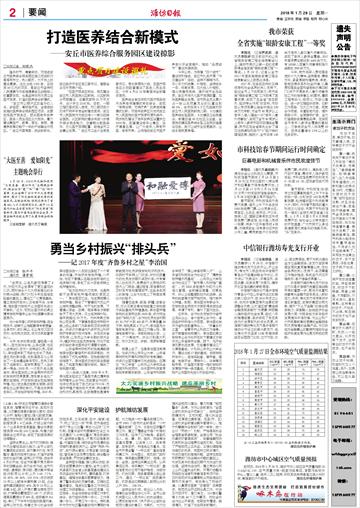 开展中医药“五进”行动 提升民众健康素养 为贯彻落实国家、省市卫生与健康大会精神,医院开展了中医中药潍坊行活动,组织专家深入社区、乡村、企业、机关、学校,举办中医健康讲座、养生保健指导、义诊咨询,进一步提升中医药健康文化素养。2017年,共举办大型义诊活动52次、中医药科普讲座63次、名老中医药专家巡讲30次,服务群众近10万人次。 实行多学科联合救治 打造10分钟绿色抢救圈 医院在实现院前、院内急救、重症监护“三位一体”的大急救中心平台的基础上,进一步优化救治流程,形成了心脏急救、脑病急救、骨伤急救、外科急救并行值班、联合救治的10分钟绿色通道,急危重患者抢救成功率提高到95%以上。2017年,医院成为半岛航空医疗救援联盟成员单位,救治范围覆盖青岛、济南、烟台、日照等省内各地市。医院多学科快速联合成功救治一高铁旅客消化道大出血的事迹被中央电视台点赞。 构筑人才新高地 搭建诊疗新平台 医院在全国范围内招聘博士、硕士研究生等高层次人才49名,人才梯队更加合理。引进上海市医学领军人才、上海交通大学泌尿外科研究所所长夏术阶,上海市优秀学科带头人、复旦大学附属肿瘤医院泌尿外科主任叶定伟,上海市领军人才、上海长征骨科医院脊柱科主任史建刚,上海东方肝胆外科医院胆道科主任、中国抗癌协会胆道肿瘤专业委员会创始人姜小清,在该院成立了名医工作室。上海公济泌尿外科集团潍坊中心、全国梅沃脊柱潍坊中心、全国胆道肿瘤规范化诊治潍坊协作中心落户该院,有力带动了医院整体技术水平的提升。