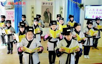2月3日,潍城区南关街道人民商城社区四点半学校的孩子们身着汉服在诵读《论语》。当日,该社区举办的“孔子学堂传统文化周”正式启动,活动旨在打造社区传统文化公益学习宣传模式,推广中国传统文化的学习和宣传平台,广泛开展以社区为主体的传统文化公益活动,让更多的人接受传统文化、传播传统文化,为文化名市建设贡献力量。 记者王晓光摄