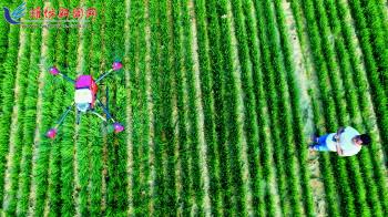 在河南省驻马店市遂平县常庄镇大兴村,“90后”无人机植保员王超运在通过手机操作植保无人机喷洒农药(3月14日无人机拍摄)。 春耕备耕时节,中原大地农事繁忙。植保无人机、电动平移喷灌机等智能设备开始应用到农业生产,助力农民春季麦田管理。 (新华社发)