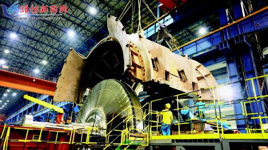4月10日,在东方电气集团东方汽轮机有限公司,“华龙一号”首台常规岛汽轮机最后一个低压模块成功盖缸。 福清5号机组两根各重280吨的低压转子在东方电气集团东方汽轮机有限公司19日完工启运,标志着我国自主知识产权核电项目“华龙一号”首台常规岛汽轮机主机设备研制全部完成。 (新华社发)
