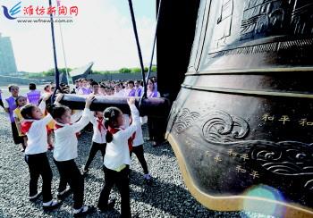 8月15日,学生代表在和平集会上撞响和平大钟。 当日,侵华日军南京大屠杀遇难同胞纪念馆举行“升国旗·撞响和平大钟”仪式化参观活动,来自日本、美国、泰国等国的国际友人和社会各界代表共同默哀追悼、祈愿和平。 (新华社发)