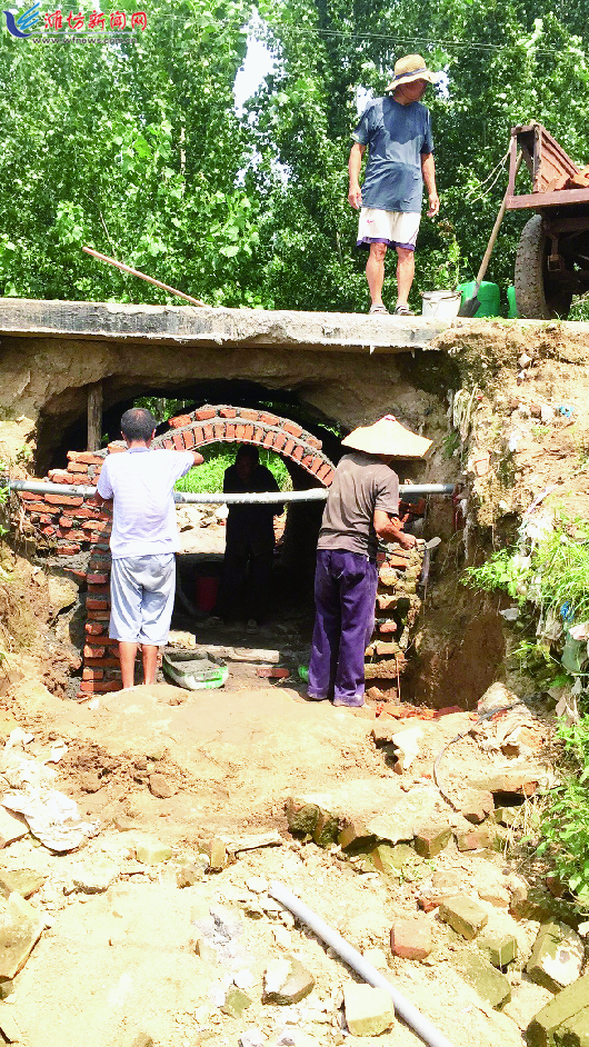 ▲近日,昌乐县红河镇大李平安村村民整修桥涵加快重建家园。 记者马林峰摄