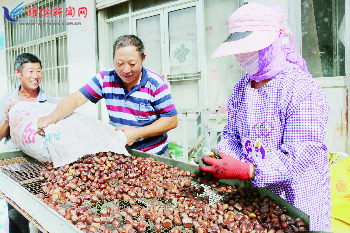 近期,临朐县九山镇5万亩板栗喜获丰收。为加快推进板栗等林果产业发展,实现产业兴旺,九山镇全力推进连片连线优质种植基地和果品深加工项目建设,形成了集板栗品种培育、技术培训、农资购销、板栗收购销售、深加工等一体化的板栗产业链,让农产品在家门口便可实现增值,日售货量突破1万斤。 图为果农开心地筛选鲜板栗,准备按照等级卖给专业合作社进行深加工。 记者付生摄