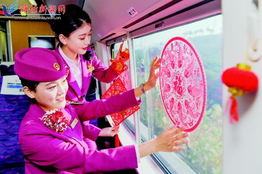 1月31日,在福州开往香港西九龙的G3001次列车上,乘务员在车厢内贴窗花。