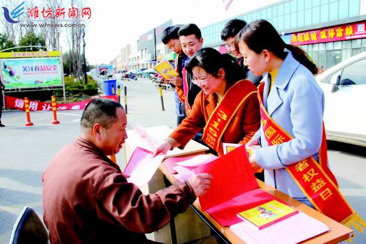3月15日,在峡山区佳乐家超市门前工作人员正在向市民介绍消费维权知识。 当日是“3?15国际消费者权益日”,我市各相关部门单位开展消费维权知识宣传进社区、进企业活动,向市民宣传消费维权和鉴别假冒伪劣产品知识,维护消费者合法权益,提高人们的消费安全意识。 记者王乐摄