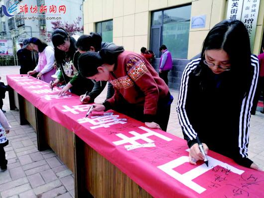 4月29日,潍城区城关街道增福堂社区开展“创城创卫 我奉献我参与”签名活动,激发群众参与创城创卫工作的热情,引导居民积极主动投身创城创卫工作中。图为活动现场。 记者王乐摄