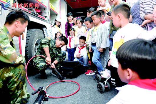 | 5月11日,安徽省合肥市云华社区组织辖区小朋友及家长走进合肥市消防救援支队万年埠中队,了解防灾减灾知识,提高灾害避险自救能力。图为消防员在给小朋友及家长介绍消防救援工具。 (新华社发) |