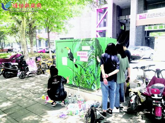 近日,胜利街旁的变电箱悄悄穿上了彩色的“新衣”,卡通、花鸟等元素的装饰让原本陈旧的变电箱彻底变了身。普通的变电箱在精心绘制下化身美丽的街头微景观,不仅让变电箱成为了人们驻足欣赏、津津乐道的艺术品,也提升了我市整体街道形象。图为几名艺术工作者正在对胜利街边的变电箱进行彩绘。 记者姜斌摄