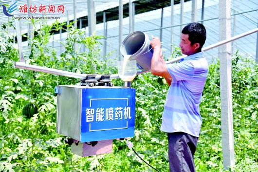 7月16日,在潍坊市寒亭区郭牌农业种植示范园,工作人员在给智能喷药机加药。2018年以来,山东省潍坊市寒亭区以郭牌农业科技有限公司、绿之园生态农产品种植专业合作社项目为引领,积极推行“公司+农户+基地”项目扶贫模式,项目收益全部用于贫困户脱贫增收,实现了项目发展与贫困户增收的双赢效果。 (新华社发)