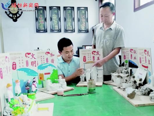 为喜迎新中国成立70周年,高密泥塑艺人聂鹏和父亲聂臣希历时5个月,创作出12幅社会主义核心价值观系列泥塑作品,向新中国成立70周年献礼。图为聂鹏父子在研讨泥塑作品制作。