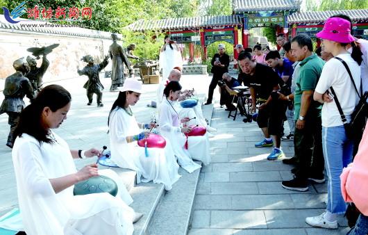 近年来,我市各地的旅游景点重视开发新的旅游产业项目,不断以“新奇特”文旅项目吸引游客,做强文旅产业,助力乡村振兴。图为寒亭杨家埠民间艺术大观园内新开发的色空鼓演奏,吸引了众多游客前来体验。 记者尚平摄