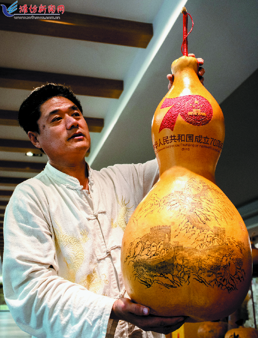 近日,寿光市葫芦世家三宝葫芦艺术馆馆长、潍坊市民间艺术大师孙希洲与潍坊市工艺美术大师袁英杰用净高七十厘米的葫芦共同制作了“庆祝中华人民共和国成立七十周年”纪念葫芦。图为“十一”小长假期间,孙希洲向游客展示纪念葫芦。 记者尚平摄