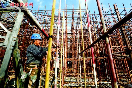 10月18日,歌尔智能硬件产业园项目施工现场,施工人员正在进行脚手架搭建施工。为快速推动项目建设,高新区成立了歌尔重大项目工作专班,积极主动与企业沟通对接,为企业提供优质服务,做到情况在一线掌握、问题在一线化解、措施在一线落实,为项目建设提供全方位保障。截至目前,项目2、3号厂房钢结构安装完成1800吨;4、5号厂房验槽完成,基础垫层完成,正在施工基础承台;动力中心基础完成,正在进行一层模板和钢筋施工。 记者王乐摄