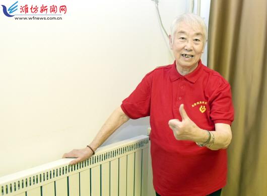 11月13日,奎文区东关街道日间照料服务中心的老人摸着热起来的暖气片竖起大拇哥,为我市提前供暖点赞。         记者王晓光摄