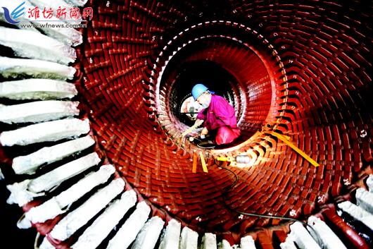 11月13日,在华电潍坊发电有限公司机组车间,工人在对一号机组进行改造施工。华电潍坊发电有限公司今冬供热面积增加到3500万平方米,占我市主城区总供热面积的70%左右,供热面积的增大对供热安全及可靠性提出更高要求。为保障冬季供暖,提升供热能力,该公司在前期对4台机组进行供热改造的基础上,今年投资9000余万元对1号机组进行了凝抽背供热改造,改造工作将在本月底完工。改造完成后,机组供热能力将由600万平方米提升至1175万平方米,单台机组可节约标煤3.5万吨,4台机组总供热能力将达到4100万平方米。 记者王乐摄