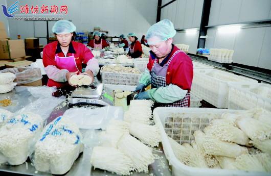 近年来,我市把培育农业主导产业作为推动乡村振兴战略的重要手段和抓手,不断壮大和升级与本地内生型传统产业,精心引进培育选择与当地资源禀赋相匹配的外置型现代产业,激活和拓展了农村主导产业的就业承载和吸纳功能,有效破解了农民就业增收难题,带动了农民增收致富。图为近日,在峡山康净园生物科技有限公司的装配车间,工作人员正在对刚下线的金针菇进行装箱。 记者刘超摄
