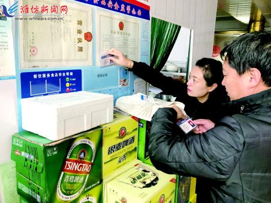 春节临近,奎文区市场监管局提前谋划,有针对性地加强节日市场食品安全监管,对节日期间消费较集中的食品生产企业、商超、农贸市场、餐饮聚集区,以及消费量大的食品品种,组织开展监督抽检工作,着力排查食品安全隐患,严防食品安全事故的发生。图为近日,工作人员在餐饮商家进行监督抽检工作。 记者王晓光摄