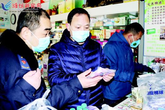 今年春节以来,面对疫情防控的严峻形势,奎文区市场监管局建立疫情联防联控工作机制,严格落实防控措施,加强对药品和医疗器械监管,严查非法渠道购进等违法行为,防止假冒伪劣“两品一械”流入市场。图为2月8日,执法人员在查处一涉嫌销售不合格口罩的诊所。 记者王晓光摄