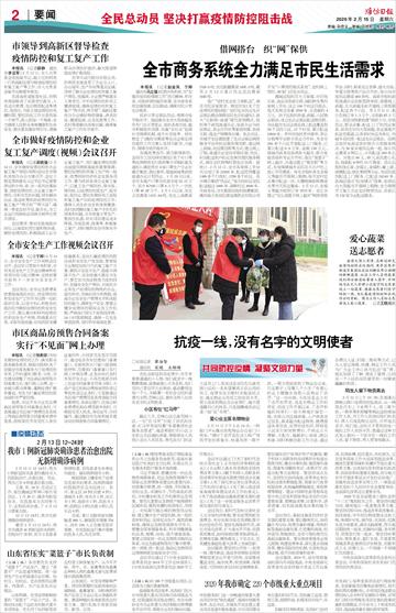 本报讯 (记者赵金凤 于卿 通讯员马立强)按照中央和省、市“加强市场供给保障工作”指示精神,和市委、市政府调供稳价部署,全市商务系统加强衔接、层层联动,确保市民日常生活需求。 抓好日常必需品供应,保障市场平稳有序。推动落实全市大型商超及所有门店正常营业,组织各类市场、超市积极组织货源,实施“点对点”监测补货保障机制,提升补货效率。研究制定了《潍坊市蔬菜等生活必需品调供稳价工作方案》,坚持不断货、不涨价,保障市场平稳有序。 加强统筹协作,助力联保联供。会同市工信局研究制定《关于对口罩等疫情物资实行政府集中采购的紧急通知》,确定我市4家口罩生产企业对潍百集团、世纪泰华、银座商城等商贸流通企业计划供应。1月29日以来,全市本地产口罩共投放市场52.17万个,其中KN95口罩6.3万个,一次性口罩45.87万个。2月1日以来,发往北京蔬菜1415.94吨,发往上海蔬菜1526.6吨,发往新疆蔬菜1655.3吨,截至2月12日累计供应武汉蔬菜1645吨。 推广“定时定点定主体配送”,满足市民居家需求。制定印发《关于在疫情防控期间推广定时定点供应生活必需品做法保障居民生活的通知》,放大“互联网+流通”现代营销模式,组织骨干商贸流通企业、电商企业与社区物业、农业合作社等紧密衔接,农商互联,推进产销精准对接。各县市区、市属开发区都组建了生活必需品网络服务平台和社区服务微信群,通过网上商城、社区微信群等方式,建立网上订购,流通企业定向采购分装,社区、村居配送到户的应急保供便民服务模式,满足居民特殊时期生活急需。据统计,2月13日,全市各类网上平台共完成订单32926单,配送范围覆盖1000多个行政村、1700多个社区。其中潍百集团“优品汇”每天向社区居民配送超过3000单,高峰时近8000单。市商务局、市大数据局组织浪潮集团、潍坊海王星辰民康连锁药店有限公司开发“口罩预约购买系统”,定时网上预约、60家门店定点供应。 潍城区组织百大万家福、中百佳乐家、食品谷农商互联、城际鲜生等四家网上平台,设立104个社区自提点,每天实现交易量2790单、交易额约4万元。坊子区组织街道、商超、小区物业联动,成立生活必需品配送微信群,全区超市生活必需品线上配送覆盖到56个居民小区、17个村居,累计配送10018单。青州市依托青州泰华、享乐宜购等平台联合农业合作社,为全市200多个小区开展配送上门服务,已累计配送6.9万单,金额138万元。诸城市商务局协调各大超市,联合家庭农场和专业合作社,推出“菜篮子”网上超市,并通过建立“微信群”等方式,有效保障城乡居民足不出户吃上放心平价蔬菜。寿光市组织寿光全福元等超市开展网上购物,每天定时定点集中配送一次,大棚现摘新鲜蔬菜水果当天到达餐桌。2月12日,全福元等超市收到订单3733单。安丘市建立“安丘菜篮子网上超市”网络销售平台,同时,联系安丘农耕、盛大市场、华夏庄园等农产品合作社,每日向市场供应蔬菜400多吨。高密市组织商贸流通企业创新思路举措,搭建线上商超,五大商超全部开通线上销售服务,配送75个小区。至2月11日,累计在线订单1.3万个、交易额87.3万元。昌邑市探索构建“政府主导、市场供应、群众点餐、配送上门”的供应体系,派员在市内大型商超、农业基地开拓进货渠道,以各农村社区为单位,为城乡居民统一配送生活必需品。临朐县依托电商进农村综合示范服务网点,与30家本地供应商一起,每日供应蔬菜6种以上,日均配送260单左右。并推出60元、65元亲民爱心礼包,每款配8种约15斤蔬菜。昌乐县组织佳乐家、全福元、金福利、庵上湖、绿蔬配送、绿色果园等企业,为居民提供配送上门服务,已配送24340单。滨海区推出“抗疫暖企”政策,协调区内大型超市开展网上购物,全力保障开工复工企业生活物资供应,目前已为132家企业配送服务。