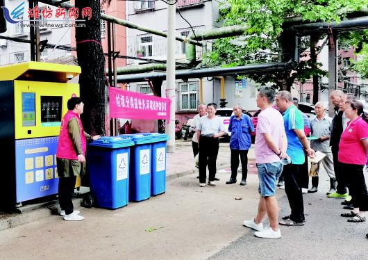 为了增强社区居民对垃圾分类知识的了解,奎文区潍州路街道健康街社区组织开展了垃圾分类宣传活动。社区工作人员向居民发放垃圾分类知识宣传单、现场宣传垃圾分类知识,号召居民积极参与到垃圾分类的行动中来,自觉维护公共卫生,共同爱护我们的美好家园。图为7月23日工作人员在给居民讲解垃圾分类知识。 记者王晓光摄