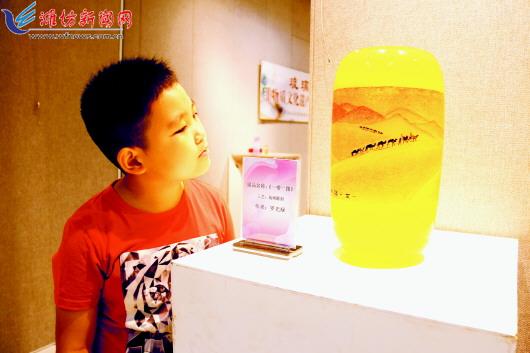 近年来,我市大力开展非遗展示展演、宣传传播等活动,普及非遗相关知识,让非遗扎根到寻常百姓家,增强老百姓的幸福感,弘扬中国优秀传统文化,坚定文化自信。近日,“琉璃非物质文化遗产中国行”展览活动在我市举办,活动增进了群众对传统文化技艺的了解与热爱,丰富了群众的文化生活。图为7月30日,一名小观众聚精会神地欣赏晶莹剔透的工艺作品。 记者姜斌摄