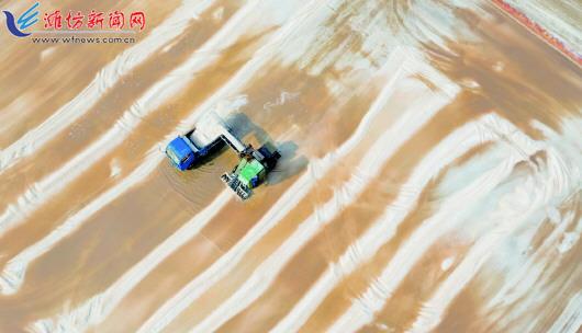 目前正是夏盐收获的季节,在潍坊海岸沿线,星罗棋布的盐池宛如调色板,色彩缤纷,美如画卷。图为滨海盐场的工人在收获原盐。