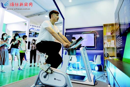 9月3日,一名记者在2020服贸会文化体育融合展区体验智能健身设备。2020年中国国际服务贸易交易会将于9月4日至9日在北京举行。9月3日,受邀媒体记者来到位于北京奥林匹克公园中轴景观大道的专题展区进行探访。 (新华社发)
