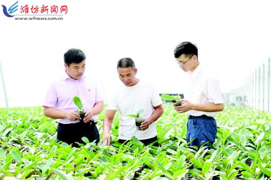 近年来,潍城区不断挖掘潜力、放大优势,大力发展特色农业产业,拓宽农业增效、农民增收致富渠道,促进农业产业发展。图为9月6日扶贫干部在军埠口美王兰园蝴蝶兰培育种植基地查看蝴蝶兰种植情况。记者王乐摄