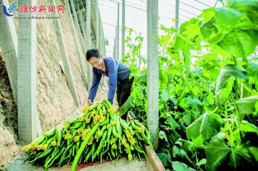 ◥近年来,寿光市紧紧围绕实施乡村振兴战略,不断加快由增产导向转向提质导向,推动蔬菜生产规模化、品质化、智慧化提升,以合作社促进农民抱团发展,加快推进蔬菜产业转型升级,促进增产增收,助力乡村振兴。图为近日菜农正高兴地在大棚内采摘丝瓜,丰收的喜悦写满脸庞。 潍报全媒体记者 王乐 摄