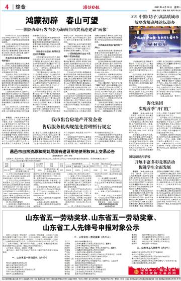 按照《山东省五一劳动奖状 山东省五一劳动奖章 山东省工人先锋号评选管理工作暂行办法》要求,为充分发扬民主,接受社会监督,现将潍坊市总工会2021年山东省五一劳动奖状、山东省五一劳动奖章、山东省工人先锋号申报对象予以公示,公示时间为2021年4月13日-19日(5个工作日)。如有不同意见,请于4月19日17时前,以电话、传真或信函等方式实名向潍坊市总工会反映(信函以到达日邮戳为准)。 公示电话:8789151、8892055(传真) 通讯地址:潍坊市总工会生产保护部(潍坊市胜利东街99号534房间) 一、山东省五一劳动奖状(共6个) 寿光环卫集团保洁有限公司 潍坊众谊汽车配件有限公司 潍坊龙海民爆有限公司 山东新华书店集团有限公司诸城分公司 中华人民共和国潍坊海关 潍坊市卫生健康委员会 二、山东省五一劳动奖章(共21人) 王仁川 潍坊中学新疆部副主任 王学清 山东寿光鲁清石化有限公司党总支书记、董事长 刘维东 山东祺月集团有限公司车间主任 汲英民 山东青州云门酒业(集团)有限公司党委书记、董事长 许倍强 山东豪迈机械制造有限公司研发工程师 严宏岳 山东新和成维生素有限公司总经理 李亚平 中国移动通信集团山东有限公司潍坊分公司党委书记、总经理 李恒亮 华电潍坊发电有限公司锅炉队磨煤机班班长 杨爱君(女)东盛生态科技股份有限公司总经理 宋君荣 山东海化集团有限公司党委副书记、纪委书记、工会主席 张宝刚 潍坊医学院临床病理系主任 吴进英(女)诸城外贸有限责任公司油炸车间主任 郑思敏(女)山东得利斯食品股份有限公司董事长 袁晓伟(女)山东省华盛农业股份有限公司实验室主任 徐成海 山东龙港硅业科技有限公司车间主任 菅凤国 昌邑市妇幼保健院党委书记 葛茂宏 潍坊市精神卫生中心党委书记 董良军 寿光富康制药有限公司研发中心主任 韩志斌 卡特彼勒(青州)有限公司高级技师 薛建文 潍坊万达汽车工具有限公司车间主任 魏华中 寿光市第一中学校长 三、山东省工人先锋号(共6个) 潍柴动力股份有限公司三号工厂总装车间 潍坊市人民医院心内一科 山东潍坊百货集团股份有限公司佳乐家TOP会员店 青州中联水泥有限公司协同创新中心 山东晨鸣纸业集团股份有限公司寿光晨鸣八厂抄纸车间丁组 比德文控股集团有限公司车身部