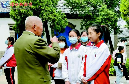 ▲近日,昌邑市文山初中组织部分师生到龙池开展“红色基地——渤海走廊”英语研学活动。活动旨在通过深入感受英雄人物的故事,并把英雄故事翻译成英文,用录制视频或英语作文的形式,把中国故事讲给世界听,让世界更多地了解中国英雄,感知中华民族伟大精神。图为在烈士祠,魏铁良老人为师生们讲述抗日战争时期的革命英雄故事。 朱象庆 摄
