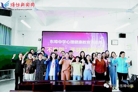 ▲为进一步加强心理健康教育,广泛普及心理健康知识,提高师生心理健康素质,安丘市东埠中学以“关注心理健康 积极快乐成长”为主题,组织开展了心理健康周启动仪式、心理健康教育讲座、心理健康教育主题班会等活动。图为“不抱怨”手环发放仪式,全体教师佩戴紫手环宣誓:向不良情绪宣战,做阳光自我。 王增升 摄