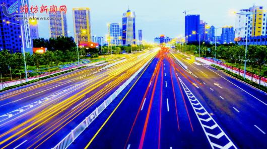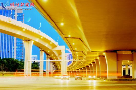 | ▲5月20日,北海路通亭街交通改造工程通车。是夜,车灯、路灯灯光交汇,流光溢彩,立交桥成为潍坊新地标、网红打卡地。 初永涛 摄(潍报视觉)