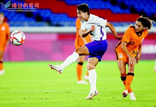 7月27日,中国队球员王霜在比赛中射门。当日,在日本横滨举行的东京奥运会女足小组赛F组比赛中,中国队2:8不敌荷兰队,小组赛2负1平无缘出线。 (新华社发)