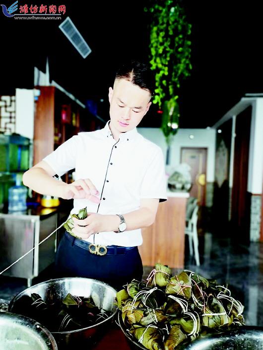 | 刘玉昌在酒店内包粽子。