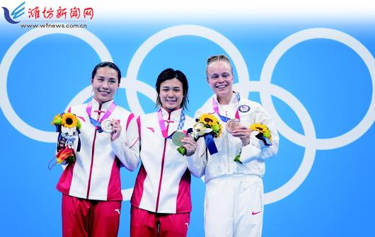 | 中国选手施廷懋(中)、王涵(左)与美国选手帕尔默在颁奖仪式上。(新华社发) |