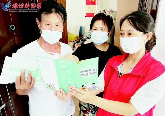 为防控疫情,连日来,奎文区东关街道李家街社区针对老年居民开展“防疫物品送到家”活动,社区将口罩、消毒液等物品送到老人家中,同时还向老人们详细讲解防控疫情知识,叮嘱老人们勤洗手、常通风、注意消毒,切实保障社区居民的健康。图为8月17日,社区工作人员给老人们送去了防疫物品。 潍坊日报社全媒体记者 张驰 摄