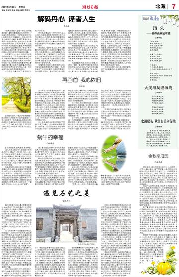 “如果说我的人生是一艘船,恩师就是那盏一直散发着温柔之光的航行灯。”这是朱振武教授的一位研究生在半月谈《品读》发表的文章里的一句话。这次见面,朱教授把这篇文章连同《莫言的电话号码》《咱这当导师的,也就这点出息!》等一并发给我分享,于我其实是学习。这些新华社半月谈推送的文章里,有朱教授刚去上海对沪上囧事的调侃,有他不卑不亢、自信从容的风骨,有他对已毕业学生的牵挂,还有他做学问的踏实与执着。 今年夏天的一个晚上,突然收到朱振武教授的信息:下个月去潍坊看你。脑海中,朱教授热情幽默的形象瞬间浮现。他总是目光如炬,总能即兴演讲、即兴作诗。和他在一起,你很难把他和著名学者、著名翻译家、博士生导师、国家重点学科比较文学与世界文学学科带头人等一时半会说不完的各种名号联系起来。 一个月后,他真的来了。有朋自远方来,不亦乐乎。 我们是在青岛的一次学术研讨会上认识的,朱教授是我导师的好友,我们也很谈得来。上次见面,是朱教授邀请我与导师一行三人到上海大学,一晃已经十年。朱教授这次是来山东鲁能乒乓球学校打全国教授杯乒乓球比赛的,他素来乒乓球打得好。 再次相见,他穿粉色上衣,脖子上戴着打乒乓球的证件,他调侃说不戴进不去学校。他总是平易近人,绝不端着架子。他称在家排行第七八甚至第九位。除了家有女儿,他家里的那些猫和狗也比他自己排名靠前,他每每出差不在家还要担心猫狗没人喂,院子里花花草草菜菜没人打理,我听后不禁哈哈大笑。 他赠我自己写的《<聊斋志异>的创作发生及其在英语世界的传播》一书。我简单说了说近来的情况,他聊起和莫言对话的场景,谈到村上春树和林少华,谈到赠聂珍钊教授的六首诗歌,谈到上海的一些情况,谈到做人做事,给我很多启发。 第二天朱教授打球赢了,我们在山东鲁能乒乓球学校又见了一次。“十年了,这十年间,想想我见过多少老师,多少学生,我还记得你,你很有才华。”一句话,既是对我的肯定,也是鼓励。 朱教授惯会春风化雨,教化学生。难怪他的学生Y这样写他,上联:泮溪池旁,春风桃李三千树。传道授业,为师为父为伯乐。挥就新论稿,指点江山,激扬文字,万种豪情方振武;下联:学思湖畔,秋月梧桐一南枝。举盏联诗,亦傅亦友亦知音。俯首故纸堆,兴继绝学,热肠书策,一怀悲悯最止戈。 他容貌基本未变,依旧出口成章,古诗词一首接一首,经常和专家学者用诗词你来我往。当他的学生,不会作点诗还真不行。打个蓝球他也要写首诗:“辛丑芒种天气新,聊发少狂不再矜。小子陪师乐球场,虚假放手也逼真。”朱教授给自己的小院配诗,“橘落南园不自甘,尚思润土化清泉。人生正如草木理,善从心生福运连。”但行好事,莫问前程。这是他做人的写照,也是我向往的人生境界。他文字功底好,口才绝佳。今年凤凰卫视跟拍他五六天,拍成了“解码丹心,译者人生”的纪录片,最近播了。期间他讲话上课,一气呵成,不用看表,讲完时间一分不差,不需要重复录制或剪辑,也是酷极了。他们共拍了五个翻译家,德语、法语、日语、英语和西班牙语五个不同语种的代表,朱教授是英语的代表翻译家。有此殊荣,我作为朋友亦替他感到高兴。作为丹·布朗小说的“御用翻译家”,他翻译的小说《达芬奇密码》《天使与魔鬼》等在国内引起轰动,几乎部部畅销,有的还拍成了电影。 后来他临走时,在火车上写诗赠我。关于他的趣事还多,或者等我将来再一一展开。