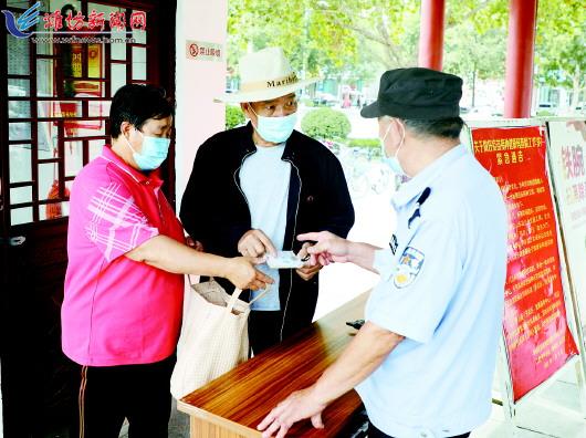 国庆假期来临,我市将迎来出行高峰期,相关部门单位在为市民提供优质服务的同时,注重加强对节日安全和秩序的管控,筑起疫情防控的坚实屏障,全力以赴做好国庆假期期间各项安全服务保障工作,确保群众度过一个欢乐祥和平安的假期。图为9月30日,工作人员对进入城区自怡园的市民严格查验健康码。潍坊日报社全媒体记者 姜斌 摄