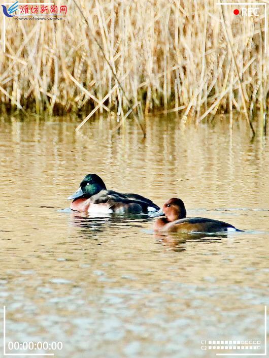 12月19日,记者在潍坊北辰绿洲湿地公园拍摄到了全球濒危物种——青头潜鸭(左)。2021年被列入中国《国家重点保护野生动物名录》的青头潜鸭总体数量一度比大熊猫还少,对栖息环境的要求非常高。青头潜鸭的出现是对潍坊湿地自然生态环境的高度认可。 潍坊日报社全媒体记者 巩建国 摄