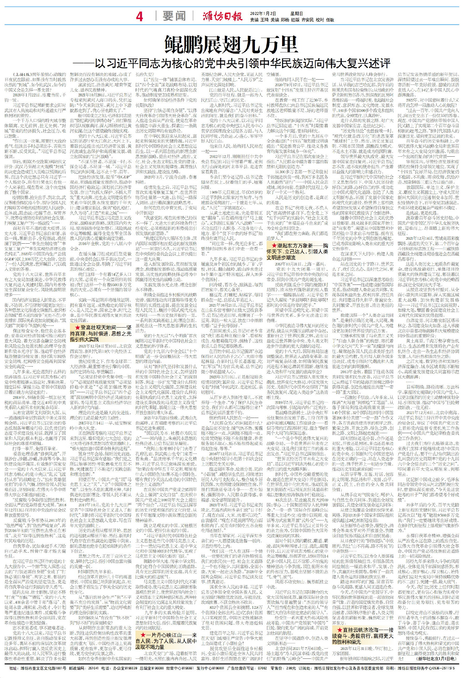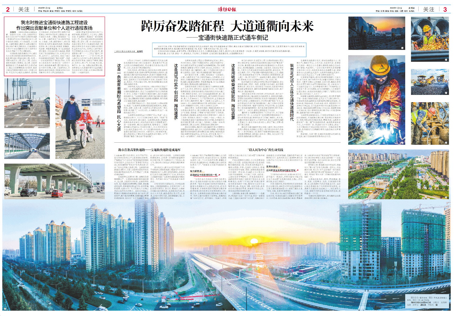 □潍坊日报社全媒体记者 石莹 从高空俯瞰潍坊大地,山河湖海巍峨浩荡,大道通衢纵横交错……宝通街快速路结束了潍坊没有高架路的历史,成为贯穿中心城区东西大通道,在有效缓解交通拥堵的同时,快速联系潍日高速和荣潍高速,高效连接潍坊火车站、高铁北站、青银高速等交通枢纽,形成“高高互联”的交通体系,成为以人民为中心的发展思想的生动实践,潍坊作为全国性综合交通枢纽的现代化城市雏形初现。 便民快车道: 从民意出发的民生答卷 “将宝通街快速路列为重大城市基础设施项目,加快建设快速路系统,积极破解道路交通拥堵问题,顺应市民对顺畅交通出行新需求!”2021年1月9日,市委、市政府决定建设宝通街快速路工程。 “随着近年来城市化进程加快,社会汽车保有量持续攀升,城区平面路网体系交通流量已趋饱和,主城区与周边县市区的连接,主城区内几个行政区的连接均是依托几条平面主干道通行,交通瓶颈效应已经日益凸显,节假日和通勤高峰时段更加严重。”宝通街快速路工程建设指挥部办公室常务副主任田太卿介绍说,宝通街交通拥堵较为严重,高峰期通行量达到每天4万辆以上,急需进行快速化改造提升——建设一条东西向的快速路是市民的迫切需求。 “人民对于美好生活的向往,就是我们的奋斗目标。”根据设计,宝通街快速路高峰时段通行能力每小时超过8000辆,道路通行能力大幅提升,车辆不仅在宝通街上可以畅通无阻加速跑,市民到汽车站、飞机场也更加方便。 站在快速路的起点和平路旁,开阔崭新的路面在蓝得像玻璃的天空下伸向远方。和平路是进出火车站南广场的重要道路,快速路的高架接地点距离和平路停止线不到三百米,也就是说,从快速路出口下来后,一脚油门就到了火车站。考虑火车站周边向来是治堵的重点和难点,快速路在设计时对和平路的交叉也进行渠化改造,使未来火车站附近车流能实现有序快速同行。 机场路是进出机场的主要道路,高架直接跨越机场路,车辆可在青年路处下匝道,调头后右转进入机场路。 “我几乎每周都要坐傍晚七点半的一趟航班去深圳,5点就从家里出发,晚高峰宝通街上堵一个小时是常有的事,饿着肚子到机场。快速路通车后,我就能在家从容吃完饭再出门了。”家住奎文区新华路的孙先生说。 城市新赛道: 道路建设中浓墨重彩的一笔 “这是打造生态绿色交通理念的重大项目!宝通街快速路可以极大降低石化能源消费。”国合华夏城市规划研究院院长,国家发改委国合中心原执行总监、研究员吴维海说。老家临朐县的吴维海长期从事政府规划、园区和开发区规划等研究工作,他认为,宝通街快速路为提高城市通行效率、节约交通时间提供了新样板,是潍坊向着“GDP过万亿、进军国内二线城市、冲刺全国大中城市综合实力前30强”目标冲刺的要素驱动。 行驶在高架桥主路段,目之所及都是独具匠心的风景:盖梁的外轮廓不是常规的梯形钢筋混凝土板,而是通过进曲面优化,展现出柔顺、平滑、优美的几何形态;桥墩采用弧线型花瓶墩,柔顺、流畅的曲面展现出浑圆统一的美感;在道路交叉口处采用大跨径预制钢梁,不仅施工方便、造价低、工期短且受季节影响小,而且景观效果好;道路照明采用路灯加吸顶灯相结合来实现桥体亮化,沿线“千灯夜市喧”的城市繁华成为新晋网红打卡地;景观绿化设计中点缀景观小品,有流水飞瀑、雨水花园,还有白色碎石铺成的旱溪,高架桥下灰色空间,处处流动清新亮丽的色彩。 立体网络、智慧交通、海绵城市……在潍坊,快速路不仅是一条行车道,更是一条景观大道,它塑造出城市的“未来感”,是潍坊城市道路建设交出的新答卷,是潍坊提升城市形象的新名片,也成为我市以工匠精神、绣花功夫践行以人民为中心的发展思想的生动实践。 发展大通道: 迈向更高发展层级的坚实支撑 “计划用5至6年时间,实现GDP过万亿、进军国内二线城市、冲刺全国大中城市综合实力前30强”这是潍坊的壮志雄心,而区域发展,向来交通先行。 历来交通便利、来往密切的区域往往能抢占发展先机。2021年2月印发的《国家综合立体交通网规划纲要》中,规划了潍坊未来“枢纽、主轴、走廊”的独特地位。 目前,我市中心城区外围高速公路已建设成环线,宝通街在城区交通体系中位置居中,东西贯通,能快速连接潍日高速、荣潍高速,与高速外环形成“快快相接”的交通体系,中心城区30分钟接入高速公路网络——这是我市加快青潍一体化协同发展,胶东经济圈往来更便捷的有利条件。 便利的交通,平添潍坊前行的砝码。网络大V、“青小岛”主笔人刘汉锋一直关心、关注潍坊发展,他认为,对于正在推进一体化的胶东而言,潍坊或许能发挥“鲶鱼效应”。胶东一体化,青岛是“带头大哥”,而潍坊则是最为积极的一个。 宝通街西连昌乐、青州,贯穿潍城、奎文、高新,东接峡山、昌邑,发展因路而提速,迈入快速路时代的沿线各县市区,与中心城区及城区各片区的联系更加密切;宝通街作为潍坊的主动脉之一,为区域导入人流,紧接而至的往往是物流与资金流,最终激活一个片区。 宝通街快速路的通车,成为潍坊迈向高速高质量发展的强力助推剂。