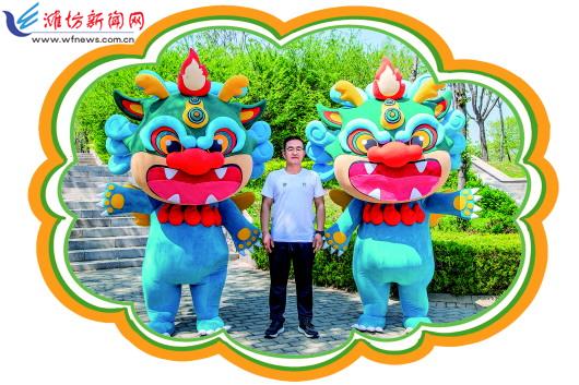 | △蔡向鹏与“峱宝宝”形象布偶。潍坊日报社全媒体记者 付生 摄 |